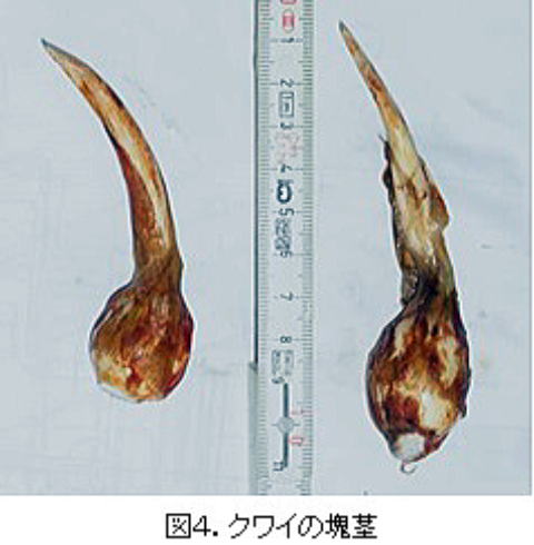 ウリカワやオモダカに比べ、格段に大きな塊茎(直径3~5㎝)をつくります。芽をつける塊茎を「めでたい」と言ってお正月のお節料理に使うのです(図4)