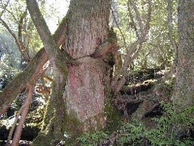 興味深かったことは、この「着生」に加え、「倒木更新」、「切株更新」である。二抱えもある倒木の上に分厚くコケが生え、その上にアケビ,ナナカマド,スギなどが生えている。成長に伴い、倒木を跨ぐように下に根を延ばし大地にしっかりと張っている。これが「倒木更新」である。江戸時代に伐採したという大きな切株の上にも杉やヒメシャラが生えている。これが「切株更新」である。着生している木のなかに、杉に絡みつき根を幹にぐるっと一周させ食い込んでいる木がある。これは「ヤマグルマ」で、見るからに「絞め殺し屋」の現場である。屋久島の森は、江戸時代には「殿様のもの」、明治に入ると「国のもの」(島の約9割)となったことが幸いし、乱開発されずに残されていると思う。