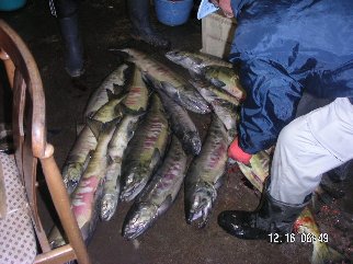 捕れたての鮭?アラスカ?北海道?ここは千葉県匝瑳郡光町栗山川河口です。堰の手前で遡上できない鮭を捕獲しています。毎年1,200匹程度の数が遡上しているそうです。今年は12月中旬で650匹程度上がっています。漁協さんのご好意で採卵・孵化場を見せて頂きました。1cmくらいのイクラがお腹に付いた状態の稚魚が泳いでいました。見学した10人程度の人が"ウオッ"と一同感激の声、いのちを見た感動に一瞬でした。