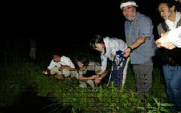 2004年8月27日、谷津田・里山レンジャー養成講座の第一弾「夜の谷津田の生き物を観察しよう」に参加させていただきました。この日は生憎気温が低く、しかも風もあったので半袖では寒いような晩でした。残念ながら今年の里山レンジャー養成講座は今のところ参加者が少ないようですが、しかし少なくても頑張ってやろうと思っております。この日来ていただいた方々は、小西由希子代表,田中正彦さん,網代春男さん,福満美代子さん,萩原真紀さん,少し遅れて小西朝希子さん,瓜生達哉さんでした。講師は千葉県立中央博物館の倉西良一先生。水生昆虫の第一人者であるそうです。先生は愛犬と共に現れました。
