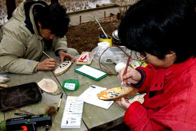 下大和田では、田んぼに元気よく泳ぐアカガエルのオタマ(写真左)をはじめ、 ちっちゃなミジンコやトビムシなど命がいっぱい。わくわくの季節到来ですね。 午後は前回の続きで、木彫りに熱中する人が続出。 そんな作品の1つがこれ(写真右)。