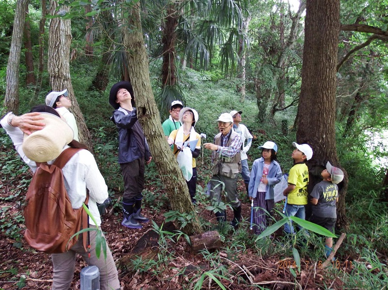 そのあと、林内を巡り自分の好きな樹木を選び、名札を作りました。名札は倒木を斜めに薄く輪切りにした素朴なものです。表面に樹木の名前、裏面に日付、作成者の名前、幹回りの寸法を記入しました。皆でなったシュロ縄で、木に結えました。