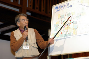 | 2003年11月23日(日)〜24日(月)、千葉県安房郡丸山町で「ちば・谷津田フォーラムin丸山町」(主催:ちば・谷津田フォーラム,ぼんた里山の会,後援:丸山町)が行われました。 23日は、会場の丸山町シェークスピアカントリ−パーク・シアターホールで開会式の後、参加者がそれぞれ、田んぼコース班,雑木林コース班,海岸コ−ス班に分かれて、丸山町の良い所や悪いを発見しながら町探検をしました。夜は懇親会や星空観察など楽しい企画がありました。 24日は、午前中、安馬谷里山研究会,みねおかいきいき館,安房農業高校など、丸山町で活動しているグループの研究発表の後、前日町を歩いて感じたことを、各コ−ス班ごとに発表しました。 午後は、ちば・谷津田フォーラム事務局長の川本幸立をコーディネーターに、「丸山町の良さ・価値の発見と再確認」と題したパネルディスカッションが実施されました。パネラーには地元の長老も迎え、会場参加者とともに熱心な討論が行われました。 |